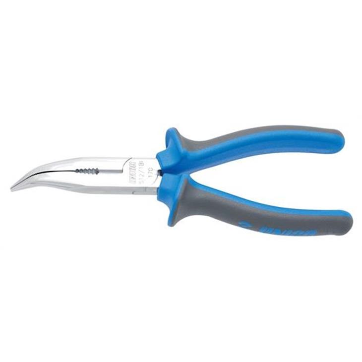 Alicate Unior de punta semiredonda con boca curvada, fabricado en acero especial para temple y endurecimiento. Mordazas largas y fuertes para un agarre preciso. Mangos en doble componente para trabajos duros.