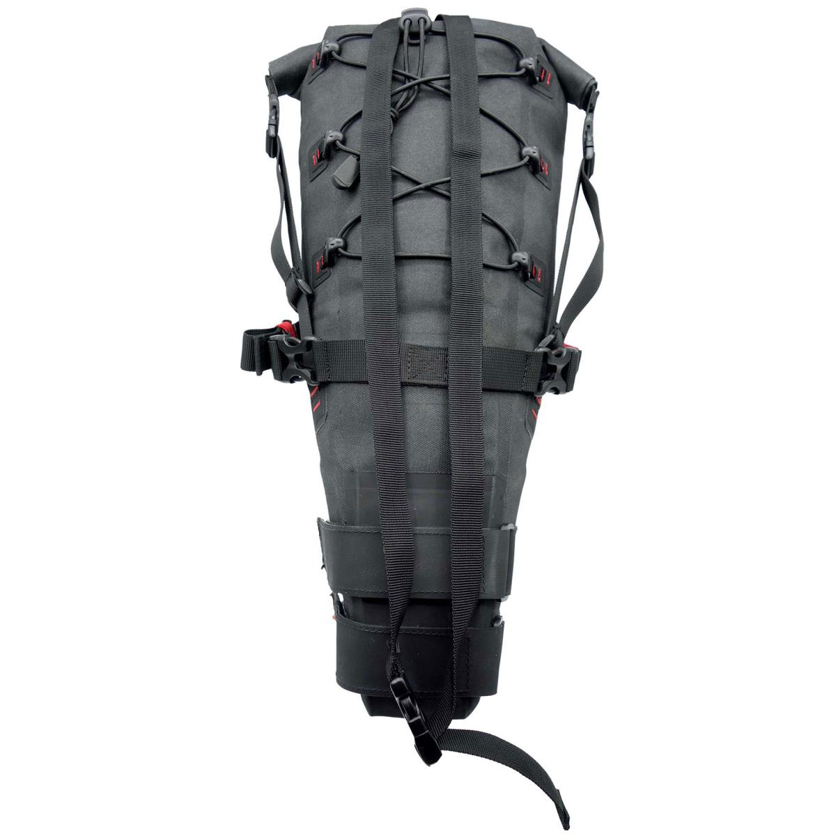 Incluye una banda elástica en la parte superior que permite llevar una carga extra en el exterior, así como refuerzos de Hypalon con detalles reflectantes para poder instalar luces traseras y mejorar así la seguridad del ciclista. La parte inferior de la bolsa y el panel frontal (el que se apoya en la tija del sillín) está formado por paneles de Hypalon de gran resistencia y adherencia.