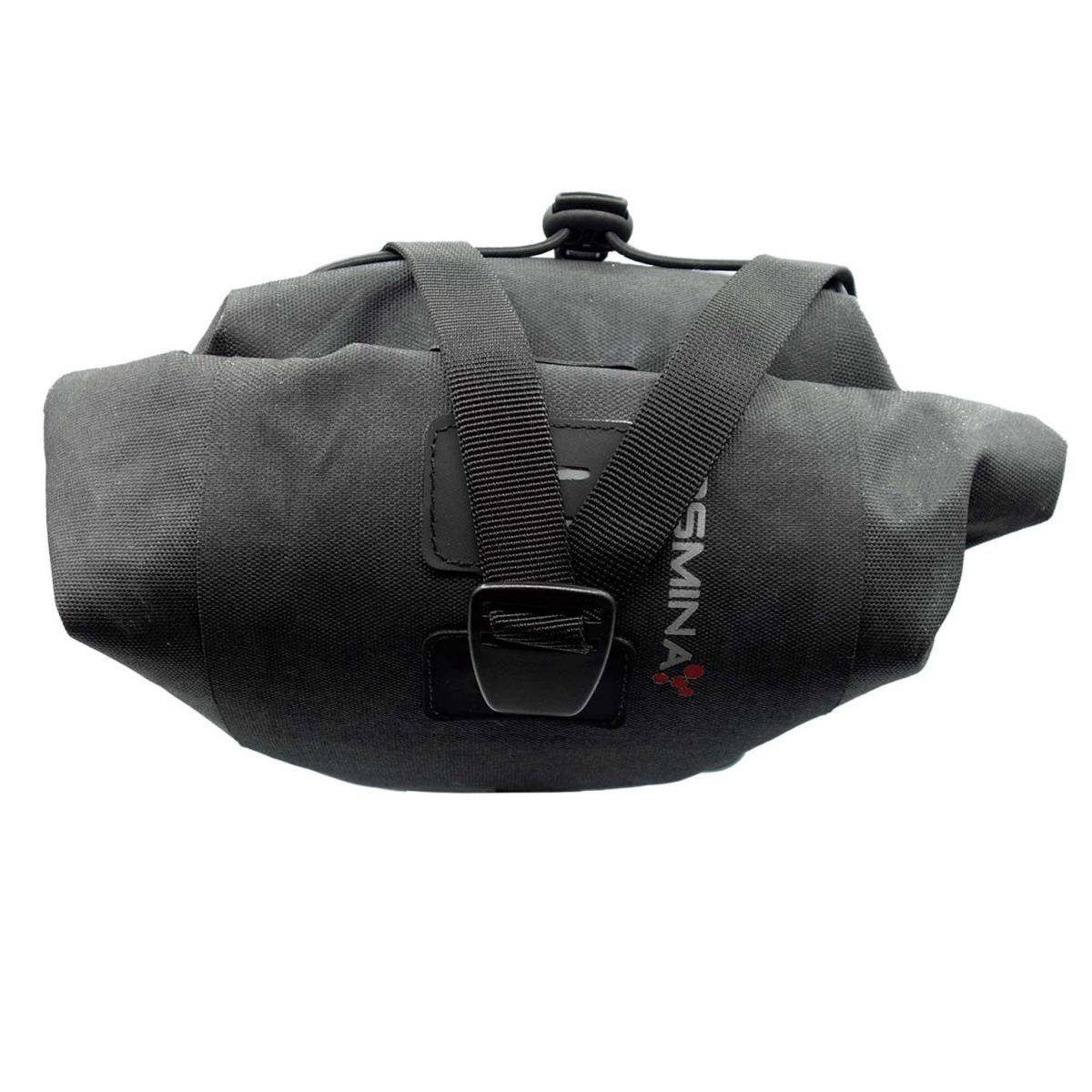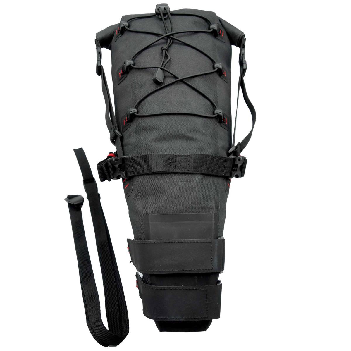 Se fija a la bicicleta con dos correas de velcro rediseñadas. Dos correas anchas de velcro, reforzadas con Hypalon, se fijan a la tija del sillín y otras dos correas grandes de velcro se fijan a los rieles del sillín. Estas últimas correas cuentan con tensores y hebillas YKK de alta resistencia que le permiten apretar la bolsa con más fuerza, para que siempre permanezca firmemente sujeta a la tija del sillín.