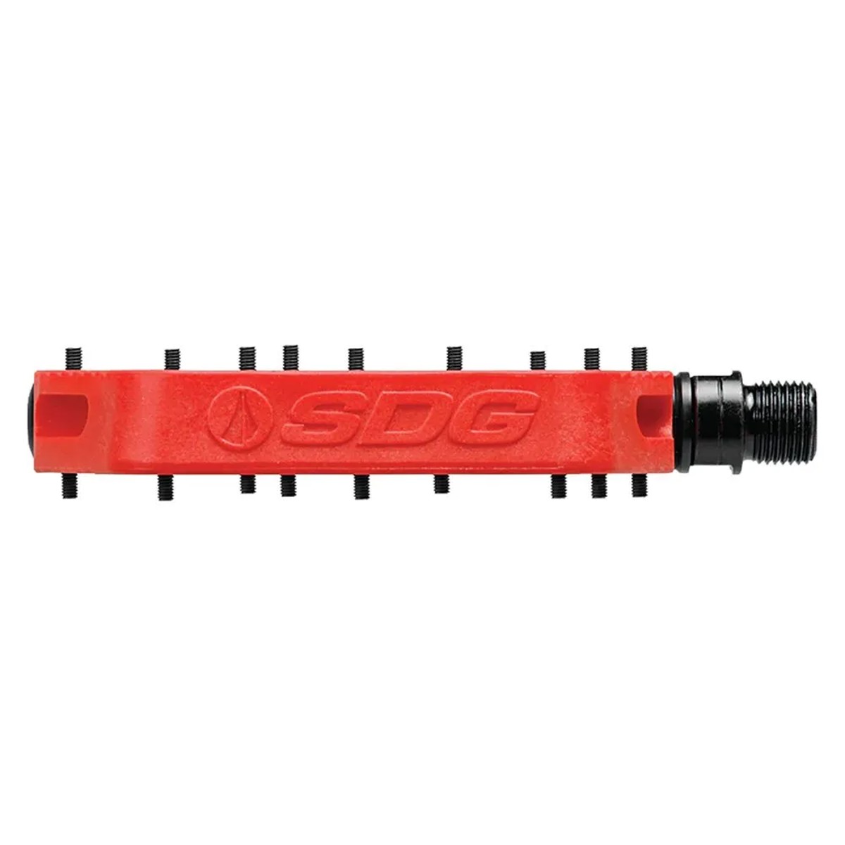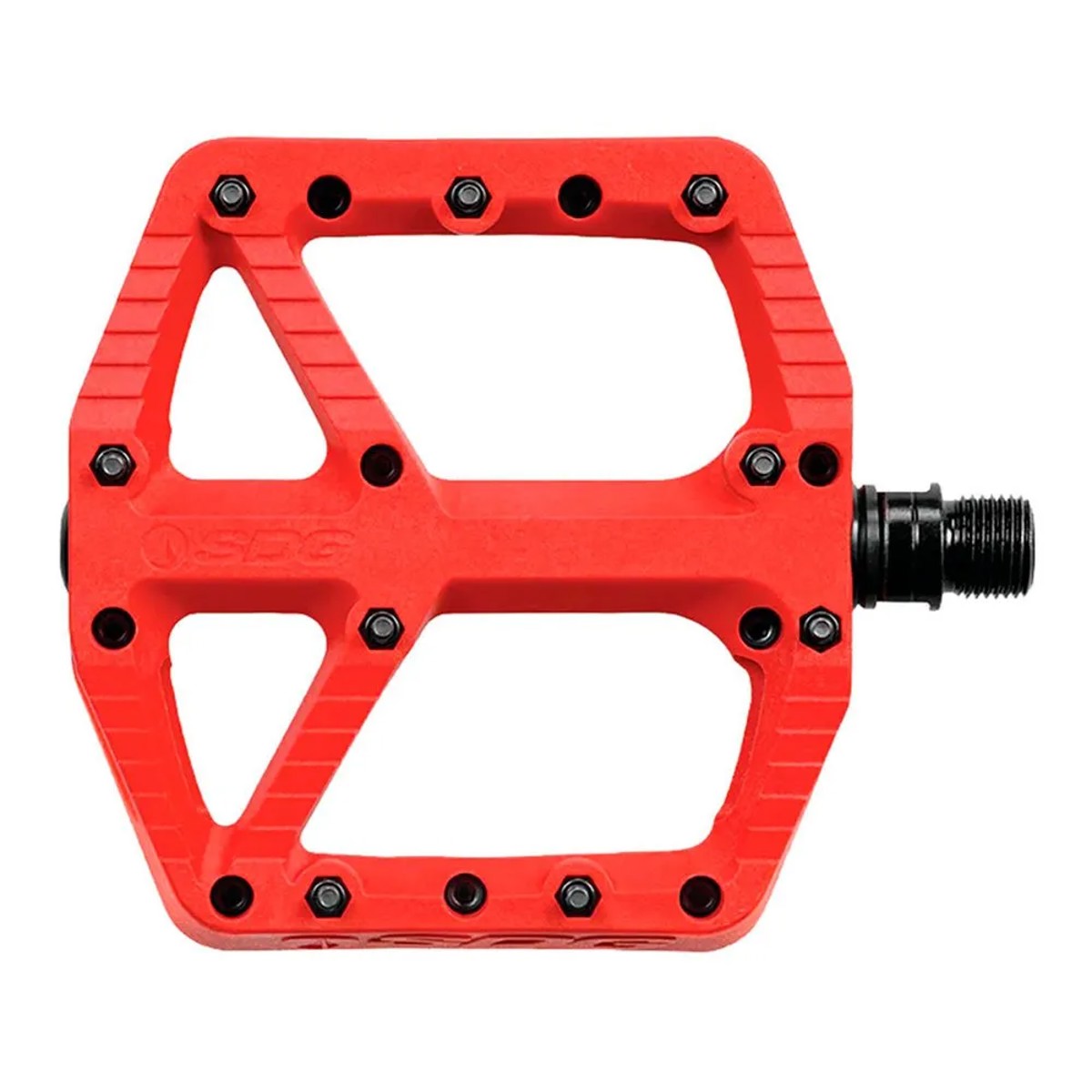 SDG Components Platform Pedale mit breiter Auflagefläche (110 mm x 105 mm), 18 Pins für optimalen Grip und bearbeiteter Chromachse für Langlebigkeit. Ideal für MTB, BMX und Skateboarding.