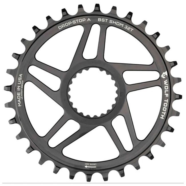 Plato Wolf Tooth Shimano DM DSA 34 dientes monoplato redondo para bielas Shimano de 12 velocidades. Diseño Drop-Stop® para una mejor vida útil y retención de cadena. Compatible con cadenas Shimano 12v Hyperglide+ y 12v KMC.