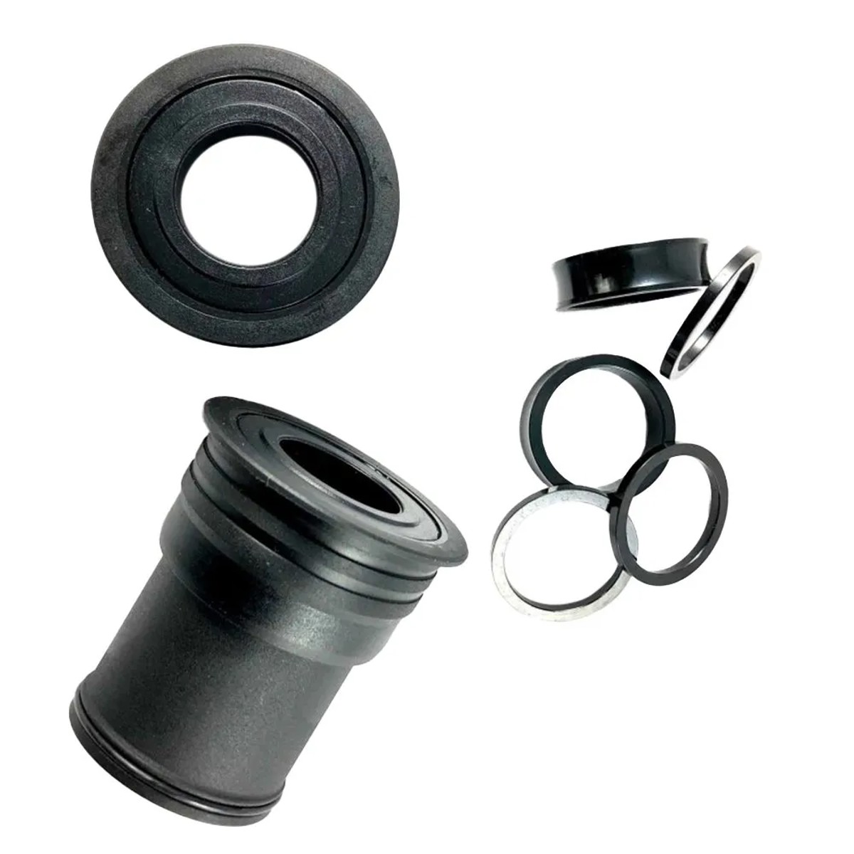 El pedalier PF30 para carretera y MTB es compatible con bielas Shimano de 24mm de diámetro de eje. Su ancho es de 68mm para carretera y 73mm para MTB, con un diámetro de 46mm. Incluye espaciadores de 2.5mm (x3) y 8.8mm (x1).