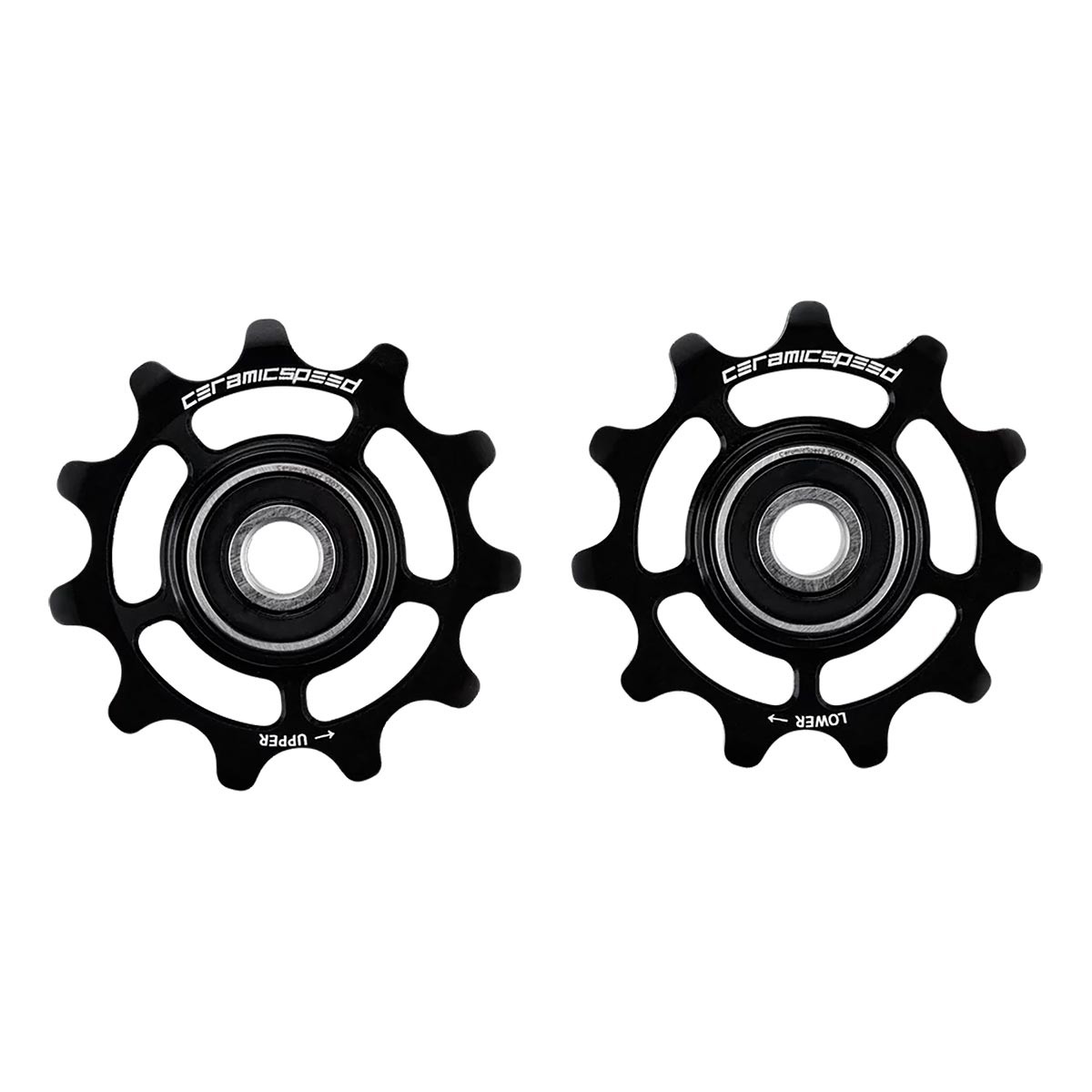 Roldanas CeramicSpeed PW de aluminio para Shimano 11-12V, hechas a mano en Dinamarca. Compatibles con cambios traseros Shimano, incluyen poleas de 11 dientes, espaciadores y aceite.