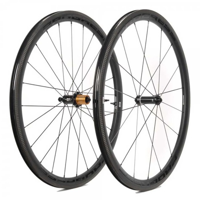 Juego de ruedas PROGRESS Aero tubeless para ciclismo de carretera. Diseño aerodinámico, ligero y resistente para mayor velocidad y rendimiento. Compatible con tubeless,núcleo Campagnolo freno de disco y diámetro de rueda 28".
