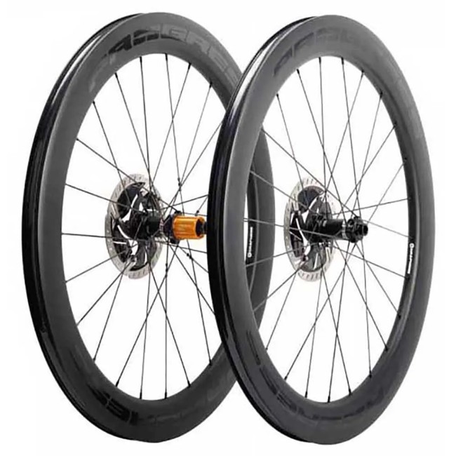 Juego de ruedas Progress Neon Disc de carbono con grafeno, perfil alto de 60 mm, 28 mm de ancho y bujes Nitro con rodamientos cerámicos. Para freno de disco y tubeless ready. Peso 1540 gr.